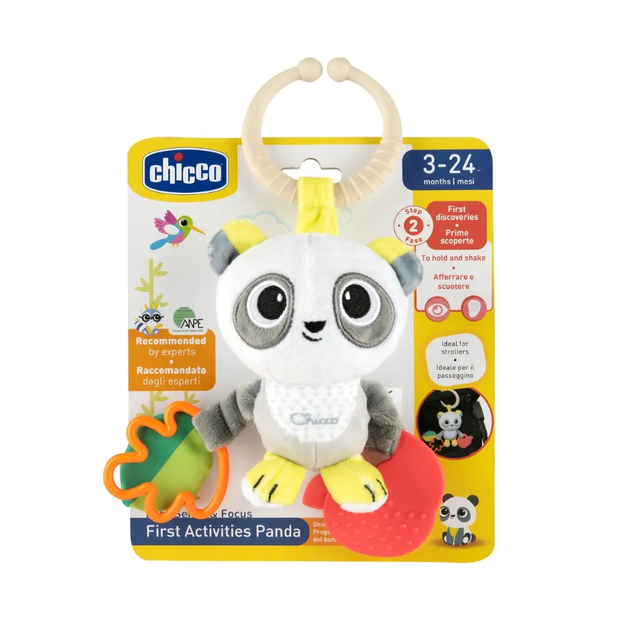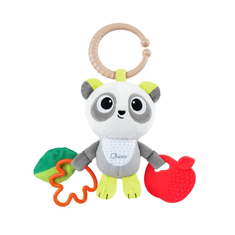 El Sonajero Panda Primeras Actividades de Chicco está diseñado para favorecer el desarrollo sensorial y la coordinación del bebé desde los 3 meses. Gracias a sus diferentes texturas, sonidos suaves y elementos móviles, estimula la vista, el tacto y el oído de forma segura y divertida.