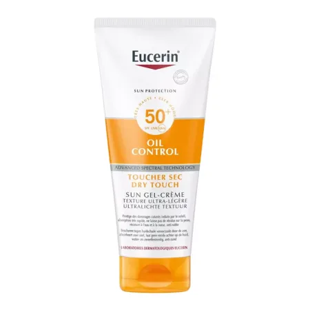 Eucerin Sun Body Oil Control Dry Touch Gel-Cream SPF50+ es un protector solar de textura ligera y rápida absorción, desarrollado para quienes sufren de piel grasa o con tendencia acneica. Su fórmula avanzada ofrece una protección solar muy alta frente a rayos UVA y UVB, mientras controla el exceso de sebo y reduce el brillo facial.