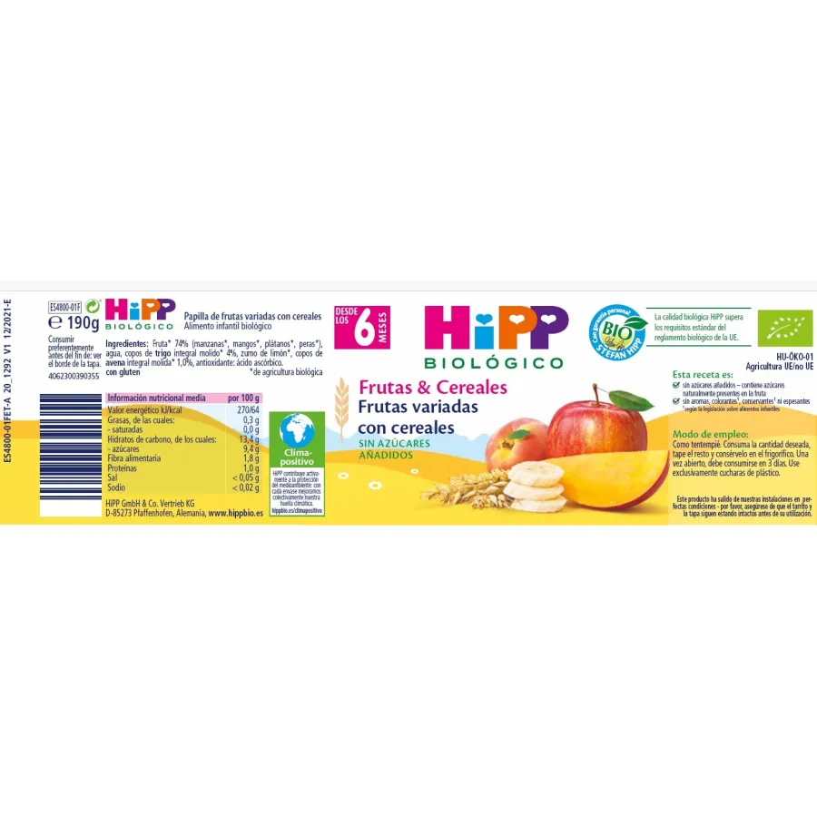 El Tarrito de Frutas Variadas con Cereales Bio HIPP es una deliciosa combinación de frutas y cereales 100% ecológicos, ideal para bebés a partir de los 6 meses.