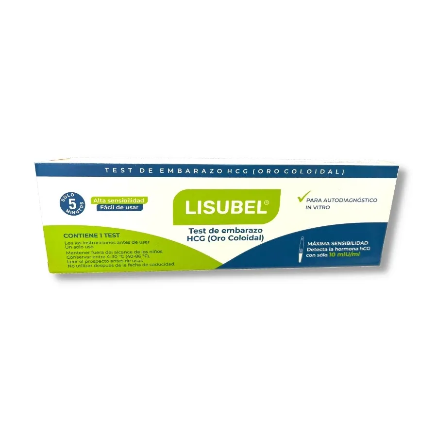 El test Lisubel Bolígrafo es un producto sanitario de diagnóstico in vitro con marcado CE (Anexo IV), diseñado para detectar la presencia de la hormona HCG en orina con una sensibilidad de 10 mUI/ml, superior a la de muchos otros test (25 o 50 mUI/ml).