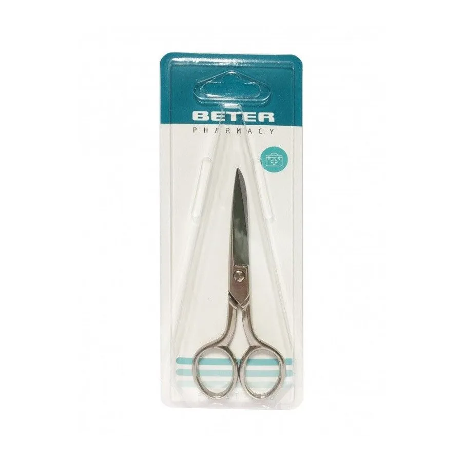 Útil tijera para botiquín de 12 cm de la marca Beter, está fabricada con acero forjado y posteriormente templado bajo los más exhaustivos controles de calidad, lo que la hace duradera e higiénica.