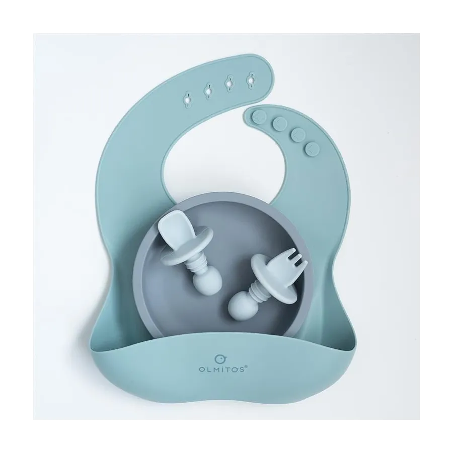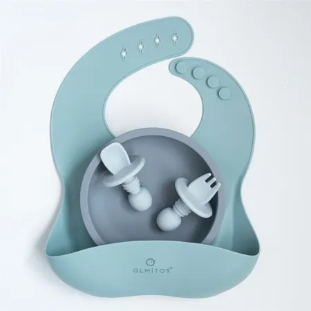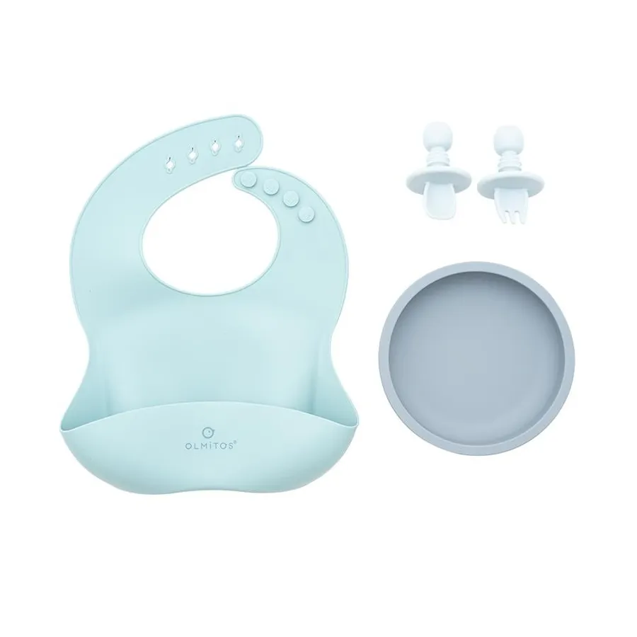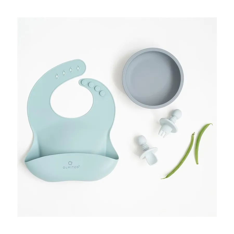 Esta preciosa vajilla de 4 piezas de silicona Blue de Olmitos ha sido diseñada para fomentar buenos hábitos a la hora de comer.