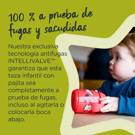 La tecnología INTELLIVALVE a prueba de trotes, impide que se derrame ni una sola gota, aunque el vaso se sacuda, caiga o vuelque. Cuenta con tapa protectora incorporada para tapar limpia la pajita y mantenerla.